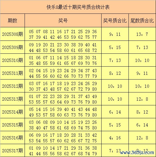 福彩欢娱8第2025317期开出奖号:01 09 10 14 17 21 29 31 36 38 41 44 55 56 58 62 67 68 74 79,其中奖号质合比为7:13,奖号余数质合比为8:12。